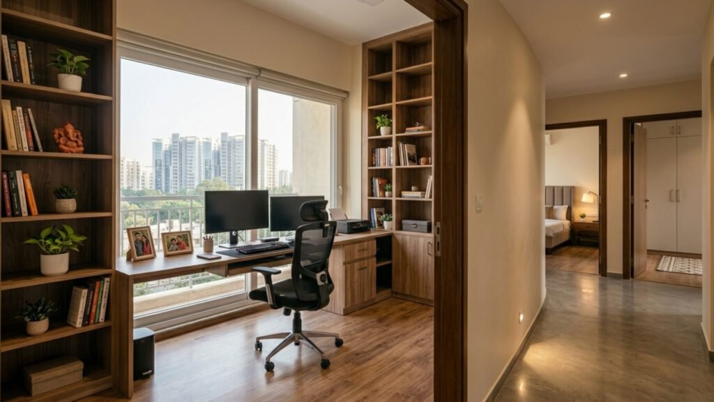 A 2.5 BHK typically has two full bedrooms plus a smaller third room (often called a “study” or “utility room”). It’s not big enough to be a full bedroom, but it’s perfect for: